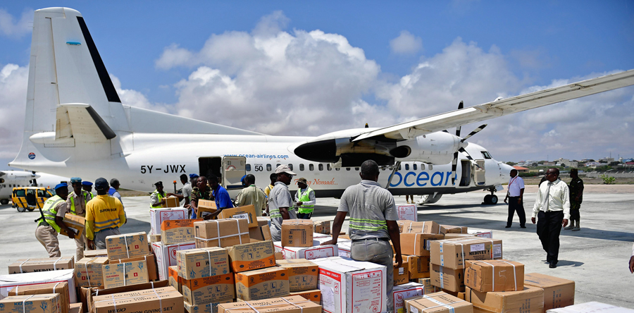 unloading medical relief goods at Mogadishu airport in a humanitarian operation