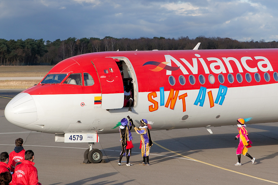 This rather exotic scene of a F100 in full Avianca colors decorated with "SINT
