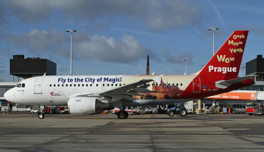 Prague" kleurenschema voorzien. Het gaat om de OK-NEP, een Airbus A319-112.