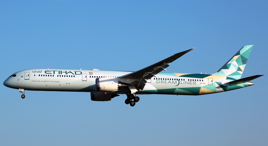 Boeing 787-10 Dreamliner A6-BMH van Etihad in het "Greenliner" kleurenschema was
