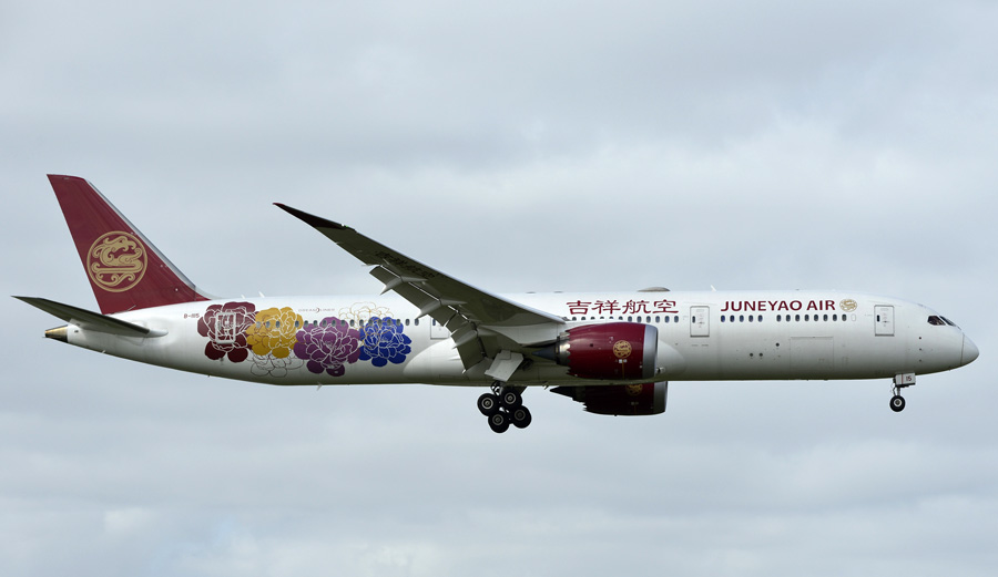 Boeing 787-9 Dreamliner B-1115 Juneyao Air voert "Chinese Peony" kleuren. Peony