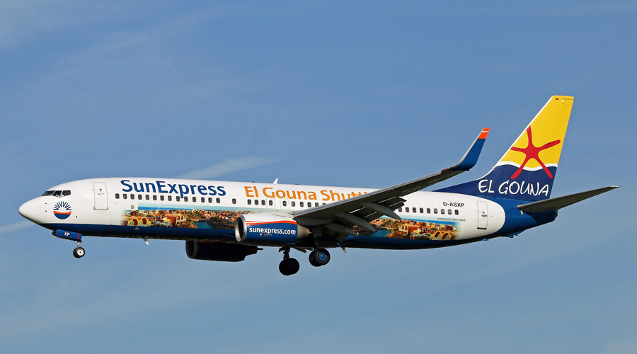 Sun Express stuurde de D-ASXP, een Boeing 737-8HX in �El-Gouna Shuttle� kleuren,