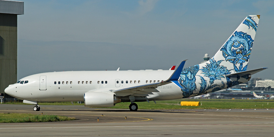 is een Boeing 737-7CJ BBJ van BBJ One is voorzien van een keurrijke staart