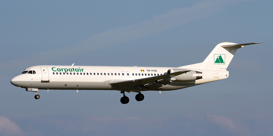 een Fokker F28 Mk0100 van Carpatair, was deze maand een vaste klant op de