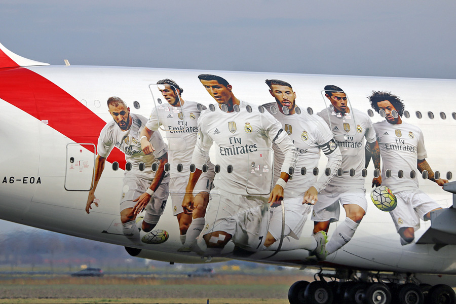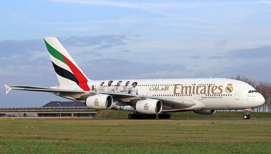 opname van de Real Madrid sticker op de Airbus 380-8 met registratie A6-EOA.