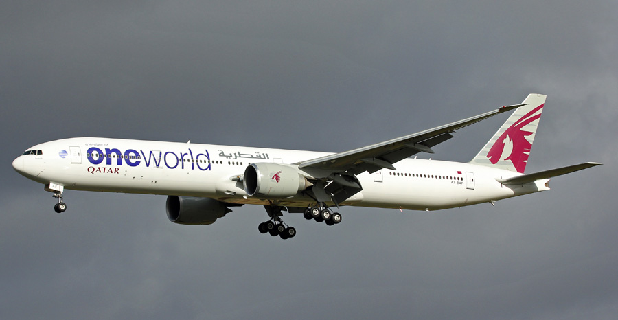 Qatar Airways heeft de Boeing 777-3DZ A7-BAF voorzien van de OneWorld kleuren.