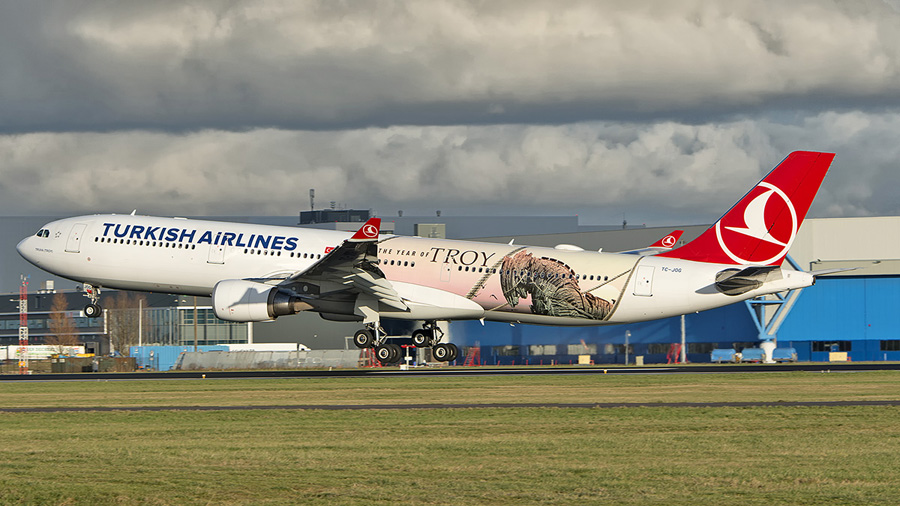 de TC-JOG, een Airbus A330-303 van Turkish Airlines voorzien van "Year of Troy"