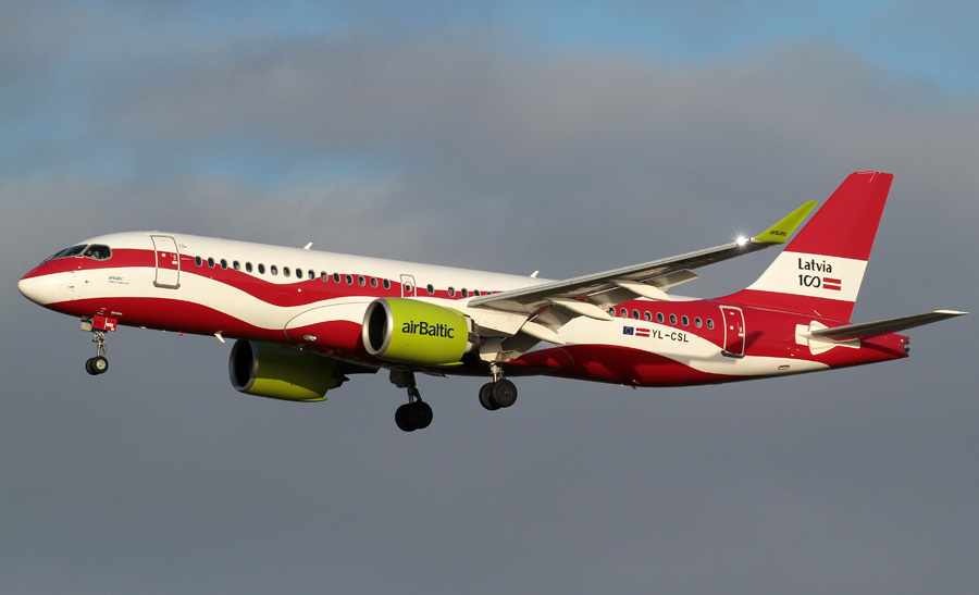 Baltic viert dat met een speciaal kleurenschema op de Airbus A220-300 YL-CSL.