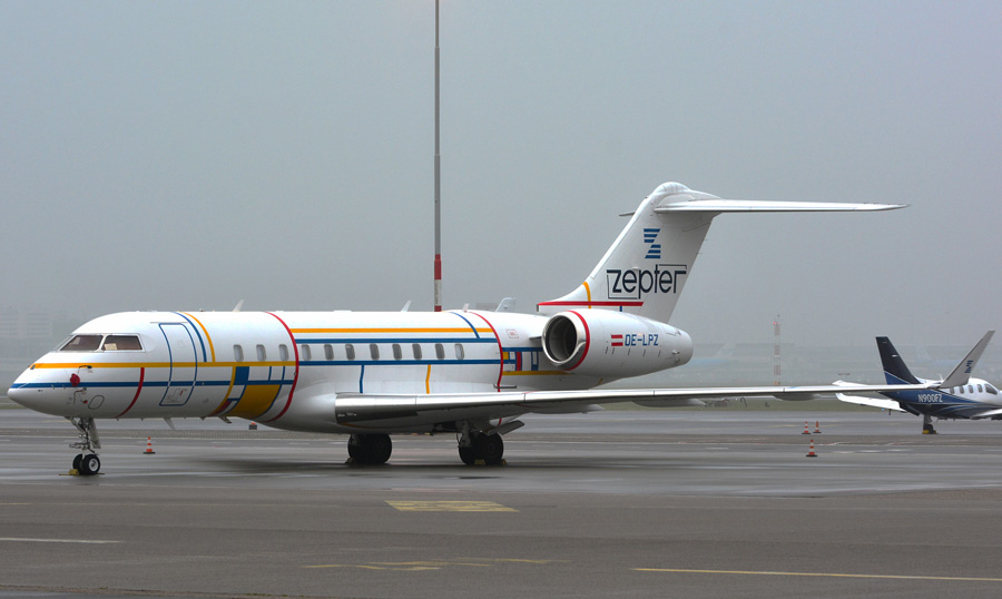 Een kleurrijke bizjet was de Bombardier BD-700-1A11 Global 5000 OE-LPZ van