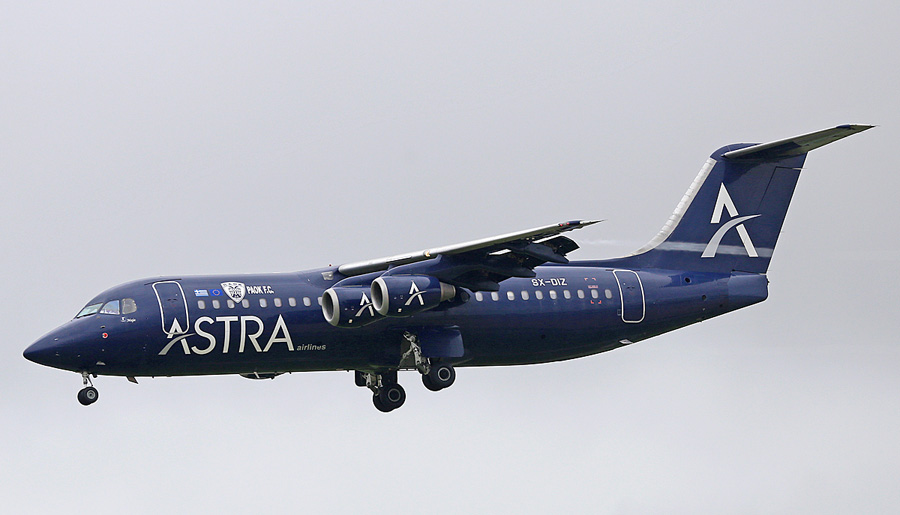 146-300 SX-DIZ van Astra Airlines. Voor de gelegenheid was de kist voorzien van