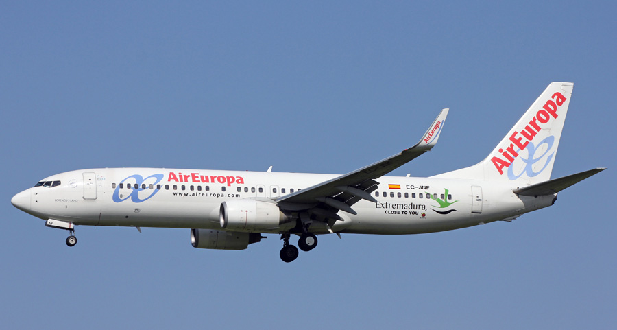 De maandelijkse Air Europa Boeing 737-85P voorzien van reclame stickers