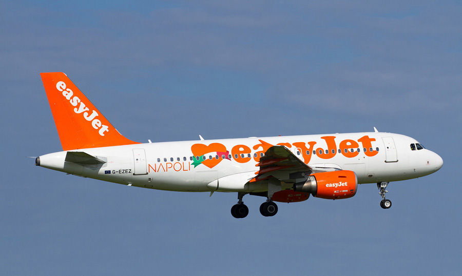 De G-EZEZ, een Airbus 319-111 van Easyjet, is voorzien van "Love Napoli"