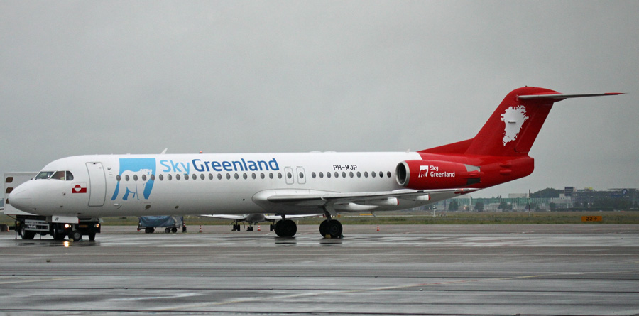 De PH-MJP, de enige Fokker 100 van Denim Air, werd voorzien van Sky Greenland