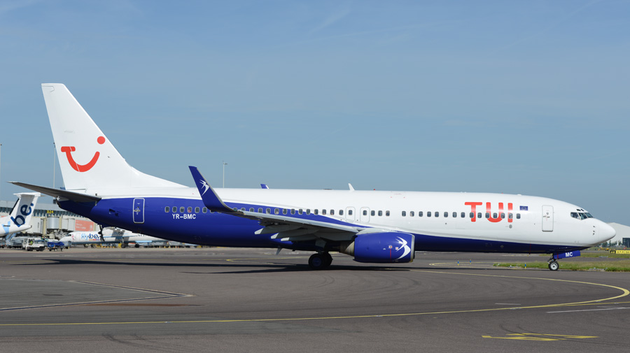 Blue Air. De YR-BMC is voorzien van TUI titels en is de ex TC-SUL van het Turkse