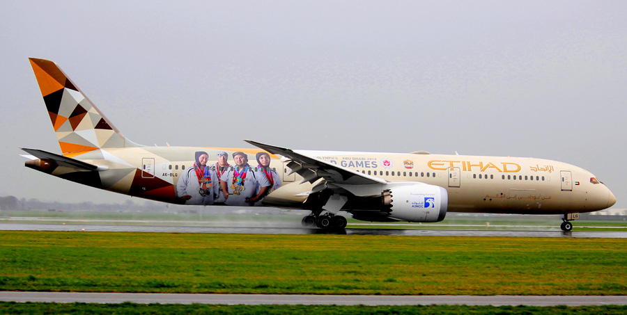 Etihad Airways heeft de Boeing 787-9 A6-BLG voorzien van World Games stickers.