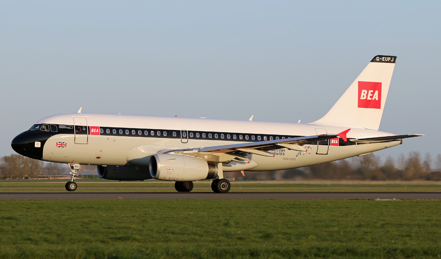 is de Airbus A319-131 G-EUPJ in de kleuren van de voorloper van British Airways