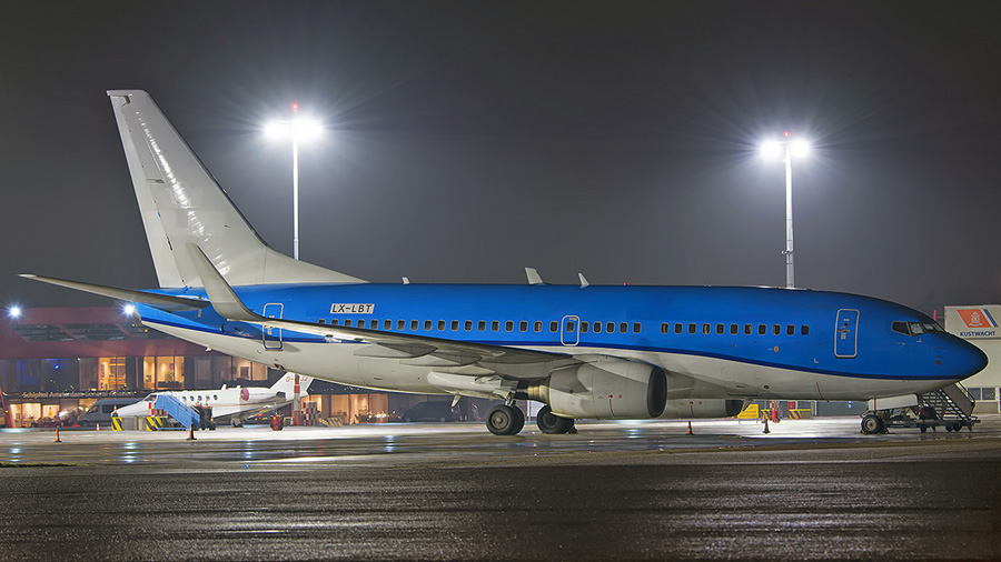 ex PH-BGE staat op Schiphol-Oost te wachten op zijn afleveringsvlucht als LX-LBT