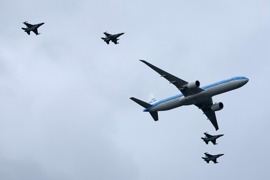 Een foto off-airport gemaakt is de formatievlucht van de KLM Boeing 777-306