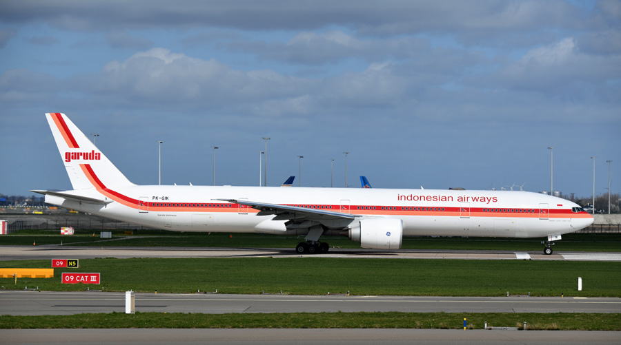 Een nieuwe retro beschildering is te zien op de Boeing 777-3U3 PK-GIK van Garuda