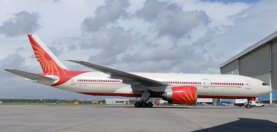India Boeing 777-235 voorzien van de registratie A6-LRE staat op Schiphol-Oost