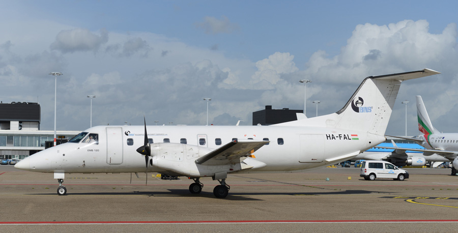 vaak op Schiphol te zien zijn de Embraer EMB-120ER Brasilia's van het Hongaarse