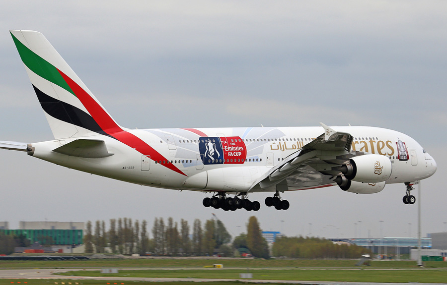Emirates Airlines maakte reclame voor de Engelse Cupfinal op Airbus A380-800 met