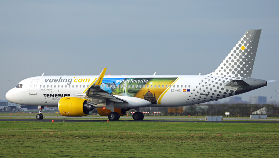 Airbus A320-271N EC-NIX van Vueling met een fraaie ogende reclame om Tenerife te