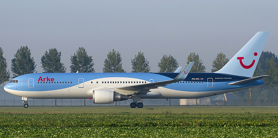 Boeing 767-304ER die van het nieuwe TUI-kleurenschema is voorzien. Daarbij is