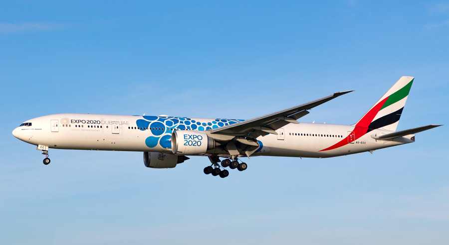 De met �EXPO 2020 Dubai UAE� opschriften vliegende Boeing