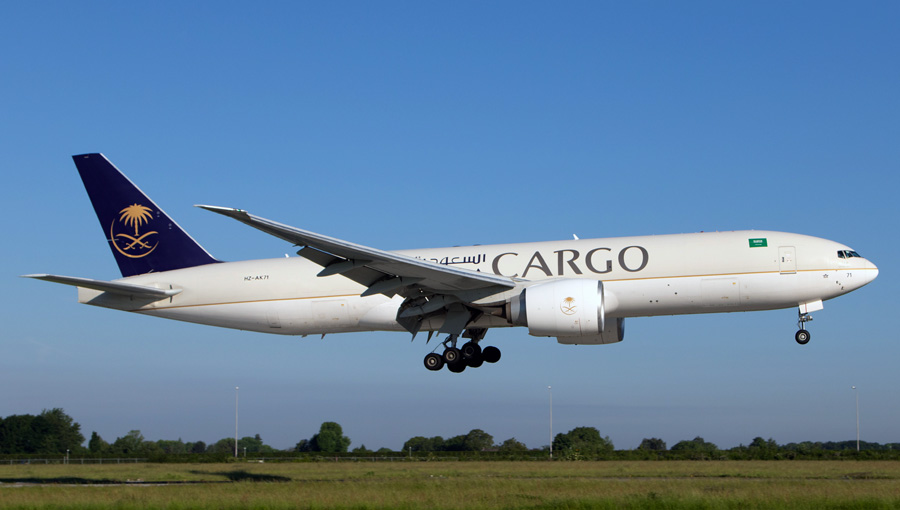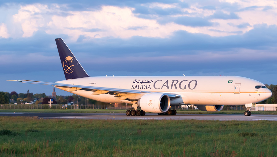 Boeing 777-FFG HZ-AK-A74 van Saudia Cargo taxiet naar de baan voor