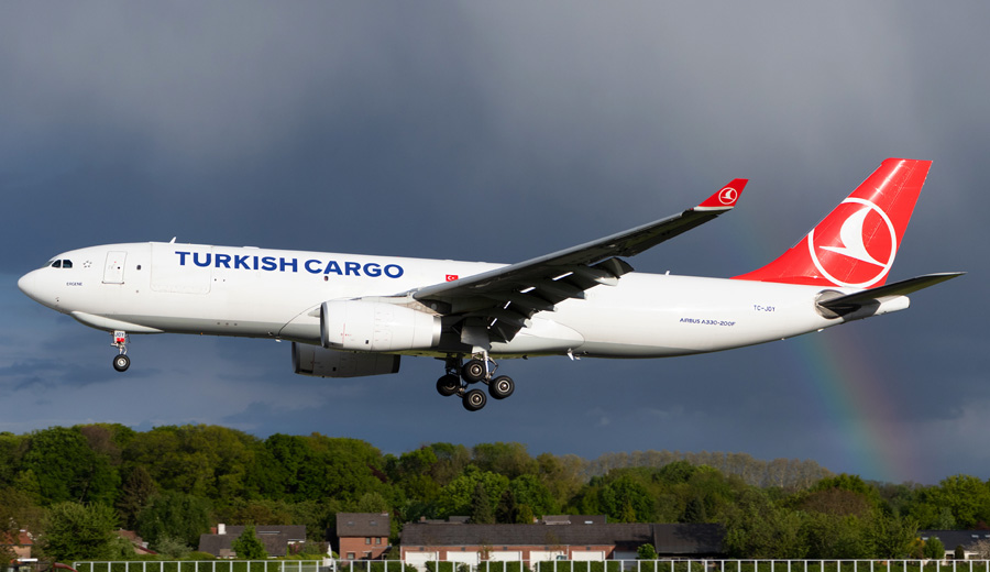 Airbus A330-243F TC-JOY van Turkish Cargo steekt mooi af tegen de