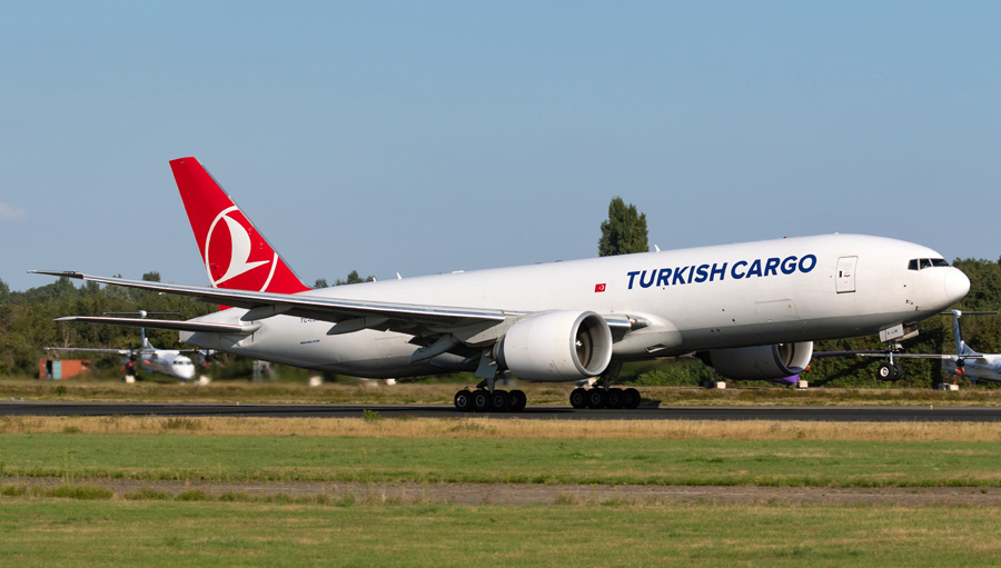 Boeing 777-FF2 TC-LJM van Turkish Cargo vertrekt naar Istanbul.