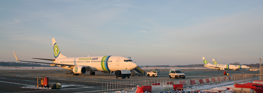 Boeing 737-8K2 PH-HSD wacht met nog twee Boeing 737-7K2's op de passagiers.