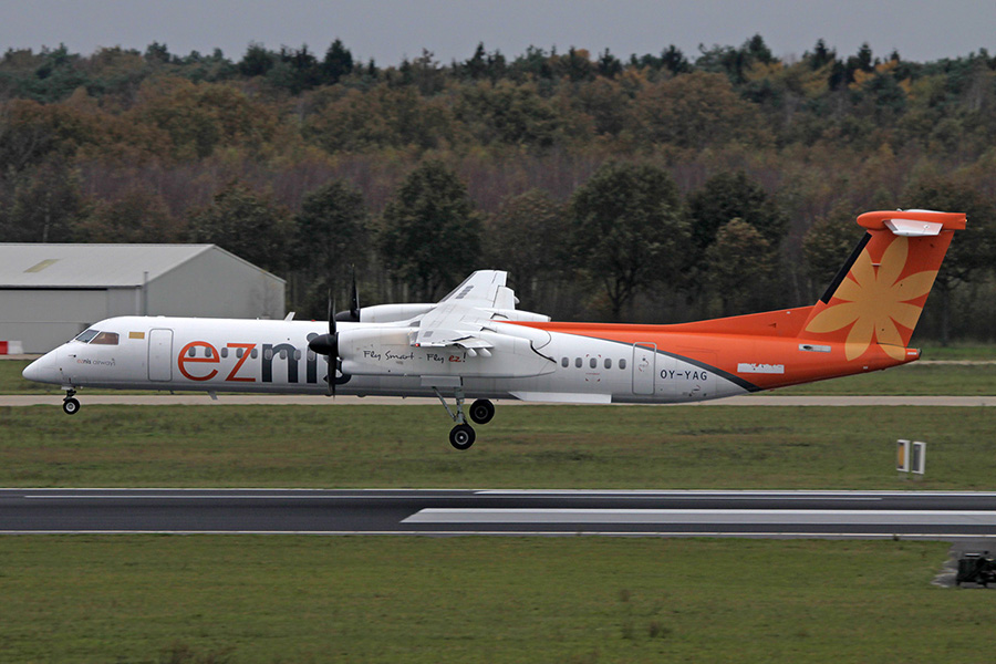 Aankomst van de in Eznis Airways kleuren vliegende Bombardier DHC.8-402Q OY-YAG,