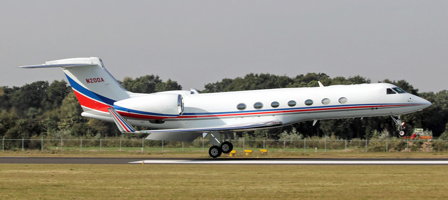 een Gulfstream G550 van de Mobil Corporation uit Dallas langs om een