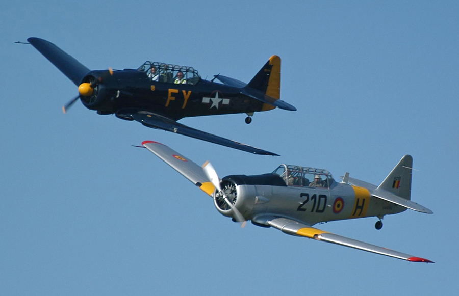 formatievlucht van AT-6A Texan N13FY en AT-6G Texan N4109C tijdens 'Wings for