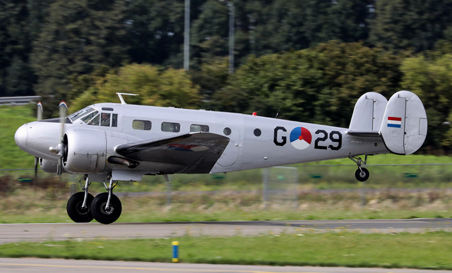 Beech D18S 3NM PH-KHV/G-29 tijdens de landing op Lelystad. (Berend