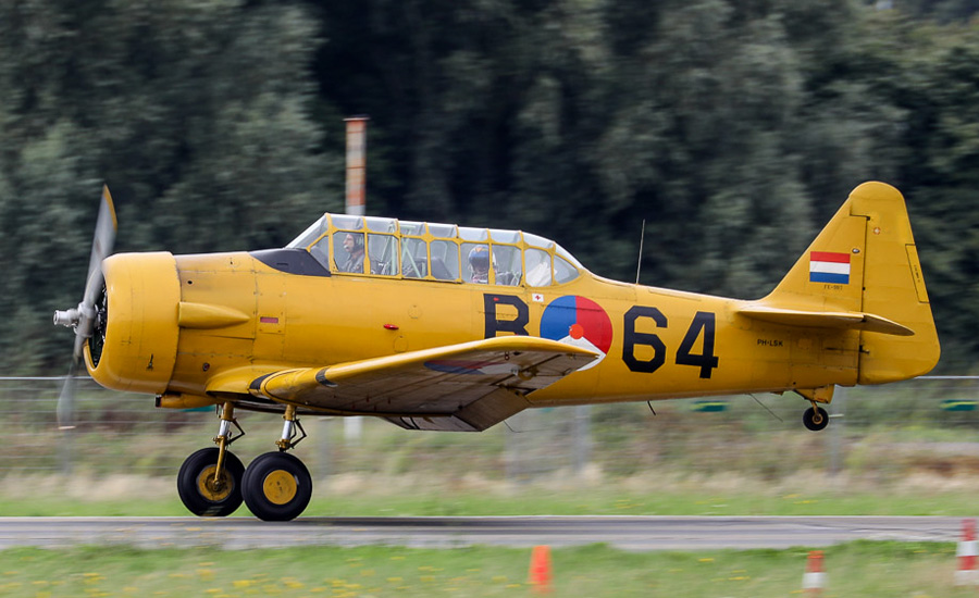 North American AT-16ND Harvard IIB PH-LSK/B-64 landt op Lelystad.