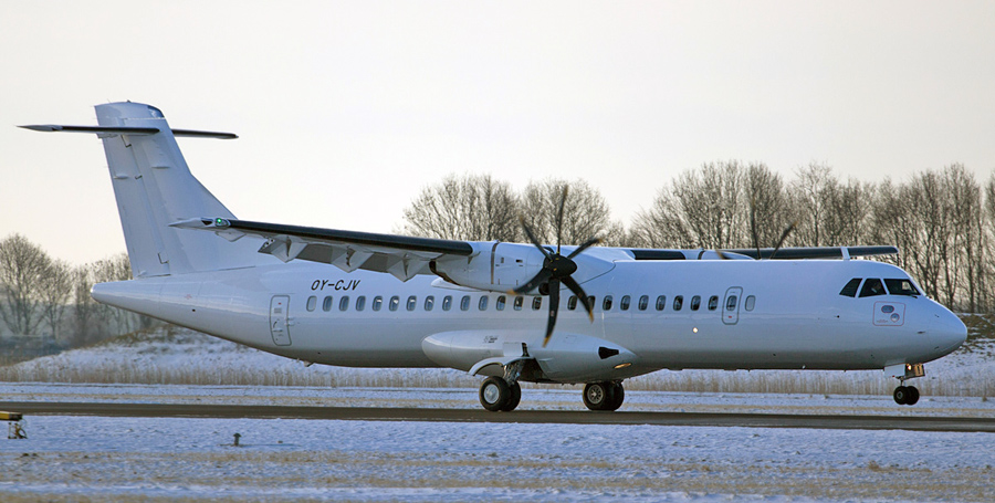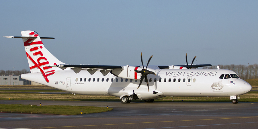 Aankomst van ATR72-212 OY-CJU die in Virgin Australia kleuren