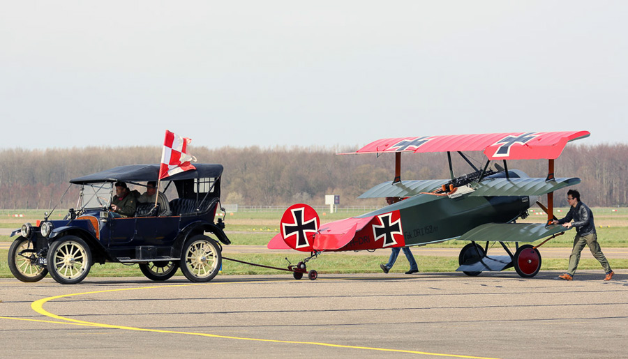 DR.I replica PH-DRI wordt teruggesleept van de Aviodrome T2-hangaar