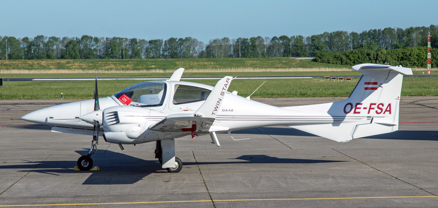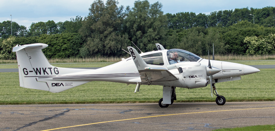 Diamond DA 42 M-NG Twin Star G-WKTG van DEA Aviation kwam even terug