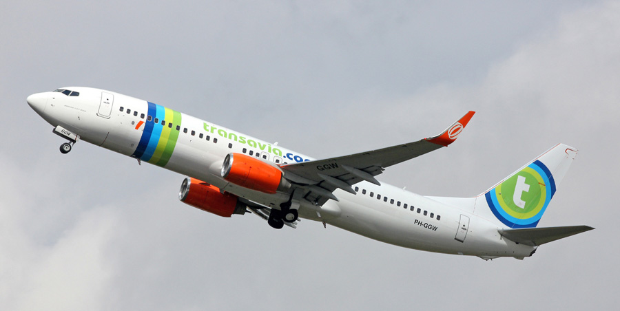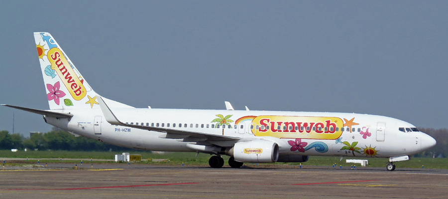 De reclame voor SUNWEB op de Transavia Boeing 737-8K2 PH-HZW ziet