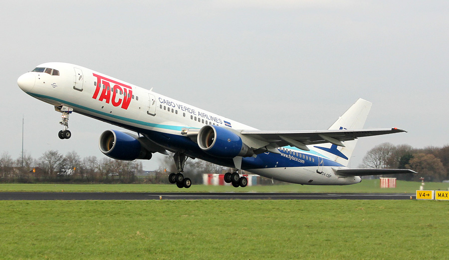 foto van de startende Boeing 757-2Q8 D4-CBP vanaf Rotterdam zijn. In