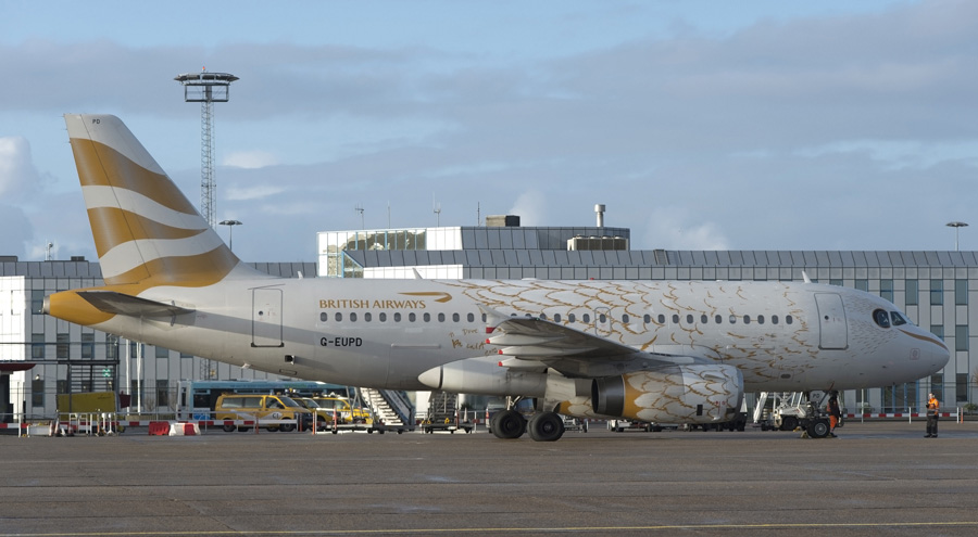 De in 'Golden Dove' kleuren gestoken Airbus A319-131 G-EUPD van British