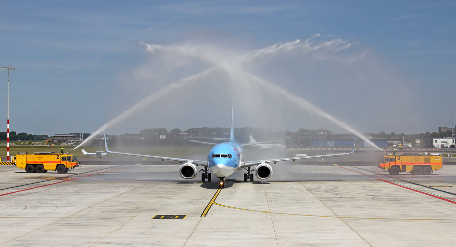 737-86N PH-TFF bij de eerste vlucht een watersaluut van de