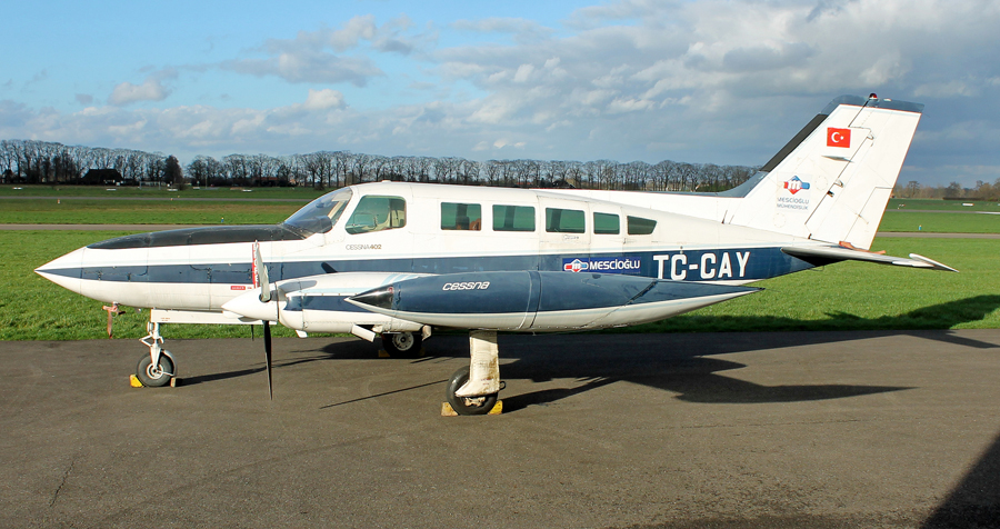 Cessna 402B II TC-CAY van Mescioğlu M�hendirlik kwam voor onderhoud op Teuge.