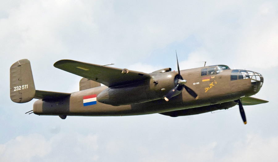 Flyby van de North American B-25N Mitchell PH-XXV. (Roy Wassink,